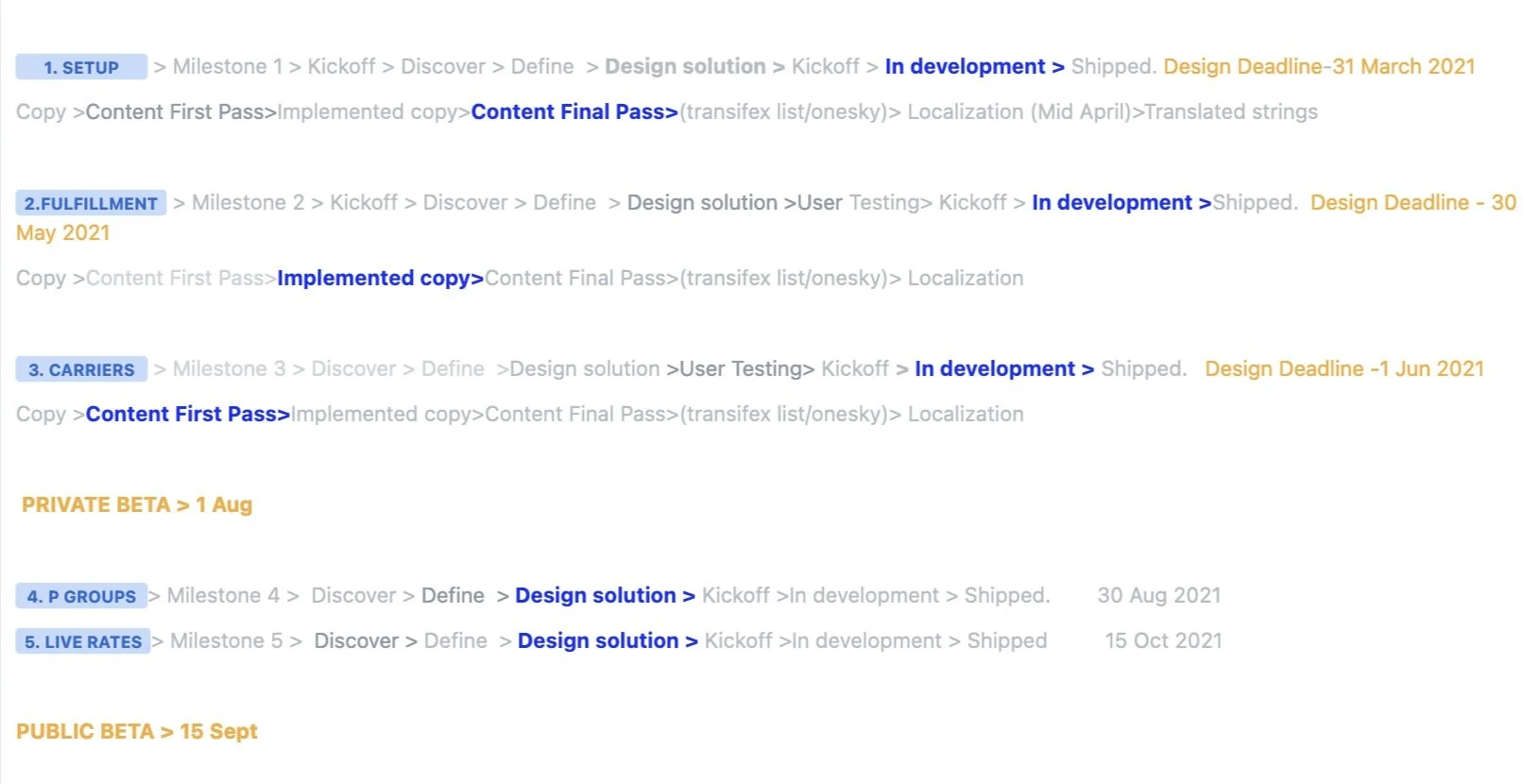 The Product Manager structured the projects into milestones, like Setup, Fullfilment and Carriers.