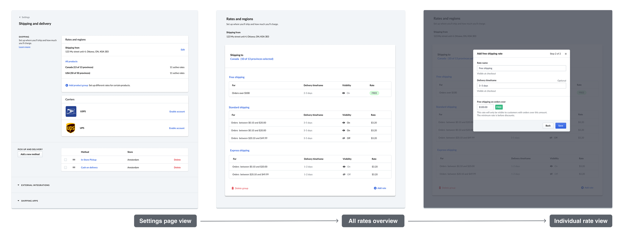 Merchants need to set up shipping rates for their customers, which vary based on factors like distance, order value, delivery time, carrier, weight, and size. After receiving an order, they buy a shipping label and fulfill the order. Since each business has unique needs, Lightspeed needed to offer flexible shipping options while keeping the interface simple and clear for merchants to navigate.